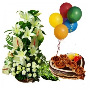 balloons +1/2 Kg Chocolate truffle heart cake + White lilies and white