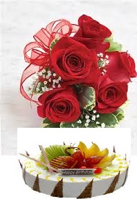 Chocolate Cake and 2 kg Fresh fruits basket 12 red roses bouquet